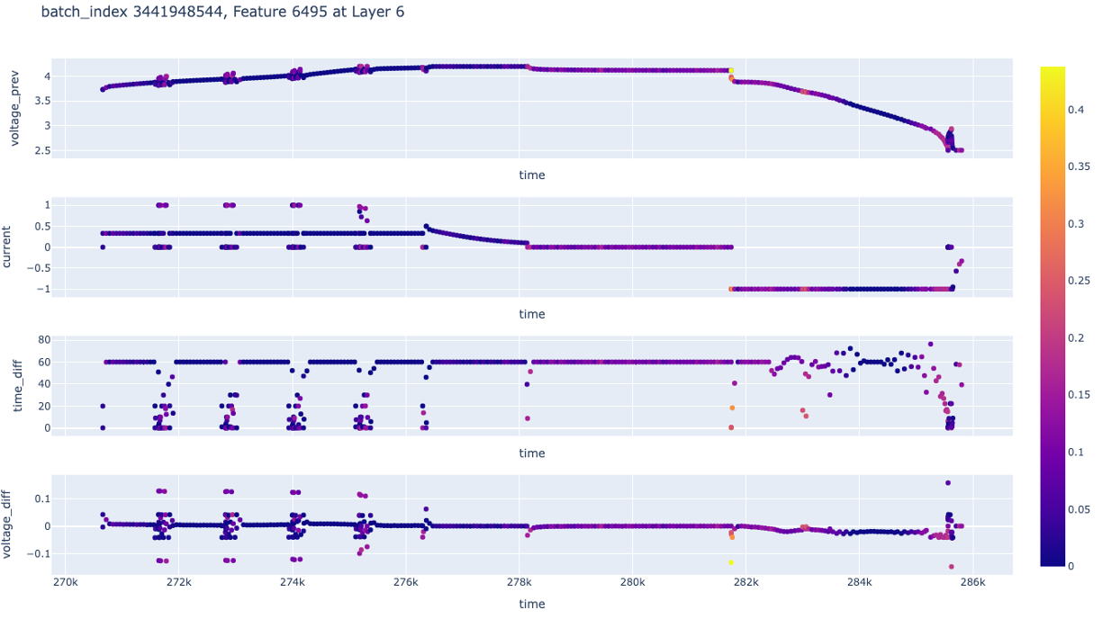 - Battery time-series data has at least three important dimensions (voltage, current, time) which must be visualized simultaneously. Additionally, meaningful patterns only emerge over long portions of sequences (the plot above shows 400 sequence points, and the total sequence length is 8192). These two facts makes visualizations quite large, as in the plot above for a single sequence.
