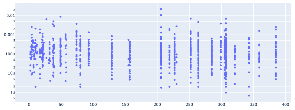 LBLM is not just memorizing the training set, but is truly able to generalize. The next-voltage prediction error rate across the test set is low regardless of how many potentially-similar cells are in the training set. The figure below shows how the error rate varies with the number of cells in the training set with the same anode, cathode, and form factor. The figure shows that the error is low even with only a handful of similar cells in the training set.
